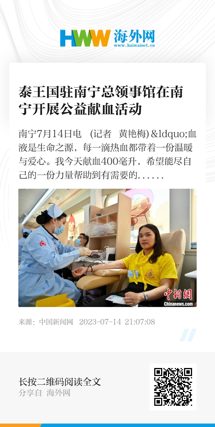 中新网南宁7月14日电 (记者 黄艳梅)“血液是生命之源,每一滴热血都带着一份温暖与爱心。我今天献血400毫升,希望能尽自己的一份力量帮助到有需要的人。”来自泰国巴真府的留学生陈文明14日接受中新网记者采访时称。