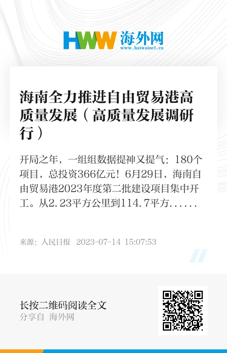2022年4月,习近平总书记在海南考察时强调:“希望海南以‘功成不必在我’的精神境界和‘功成必定有我’的历史担当,把海南自由贸易港打造成展示中国风范的靓丽名片。”牢记习近平总书记嘱托,海南完整、准确、全面贯彻新发展理念,全力推进自由贸易港高质量发展,加快构建开放型生态型创新型现代产业体系。