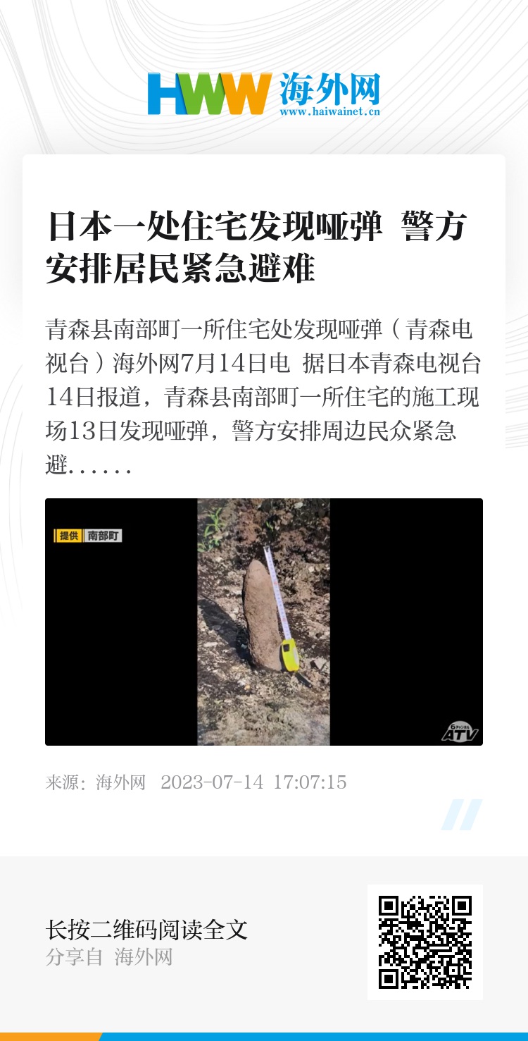 海外网7月14日电 据日本青森电视台14日报道,青森县南部町一所住宅的施工现场13日发现哑弹,警方安排周边民众紧急避难。日本自卫队称炮弹不会爆炸,已进行回收处理。