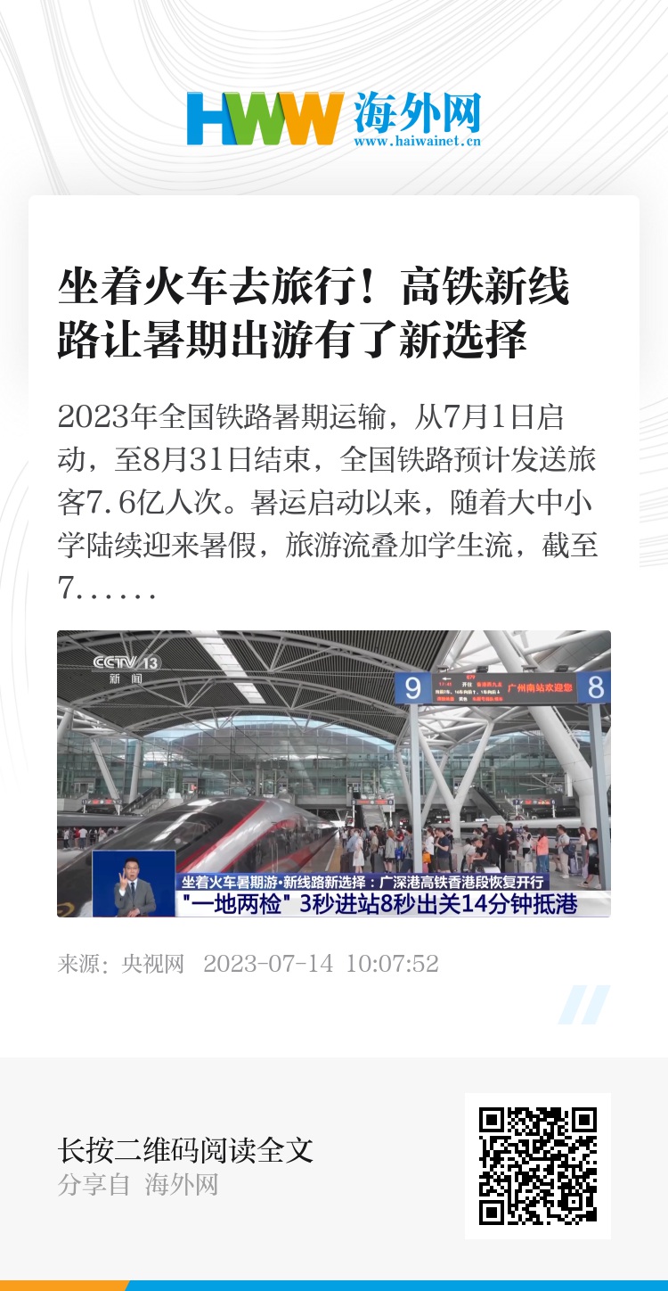 2023年全国铁路暑期运输,从7月1日启动,至8月31日结束,全国铁路预计发送旅客7.6亿人次。暑运启动以来,随着大中小学陆续迎来暑假,旅游流叠加学生流,截至7月12日,铁路暑运日均发送旅客1315万人次。暑运期间,不少新开通或新提速的铁路线路迎来首秀。新线路给旅客带来了哪些新选择?一起看↓