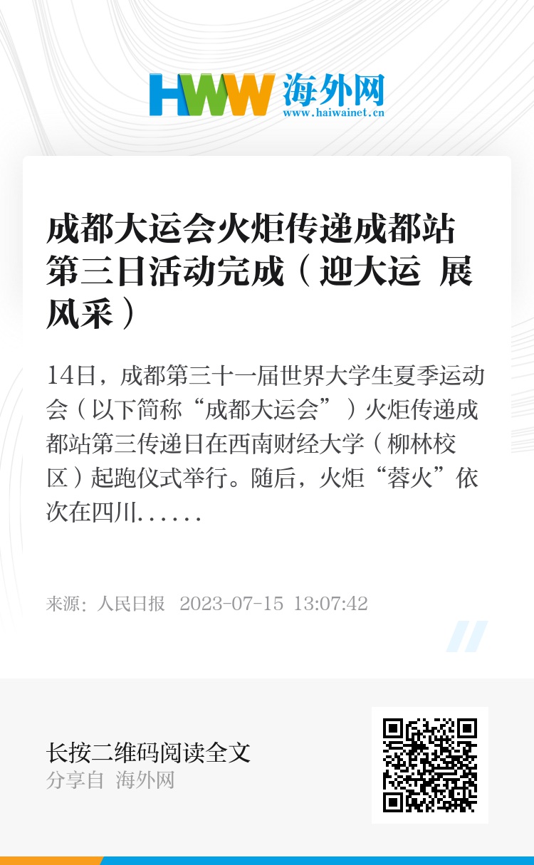 据了解,7月20日和26日,成都大运会火炬传递将继续在成都市内部分高校和东安湖体育公园进行。(记者王永战、孙龙飞)