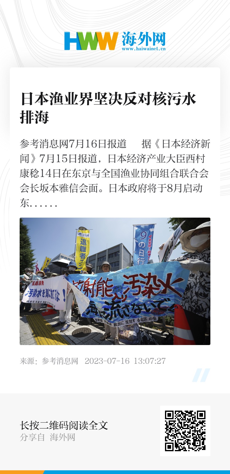 参考消息网7月16日报道 据《日本经济新闻》7月15日报道,日本经济产业大臣西村康稔14日在东京与全国渔业协同组合联合会会长坂本雅信会面。日本政府将于8月启动东京电力公司福岛第一核电站处理水排海计划,西村希望全渔联对此予以理解。坂本表示:“现阶段坚决反对处理水排放入海的立场不变。”