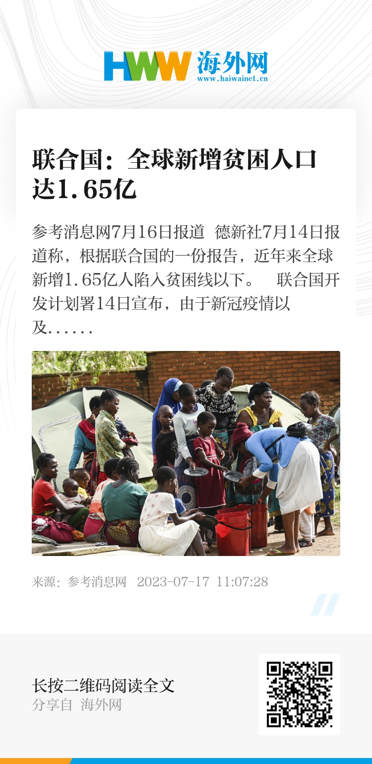 参考消息网7月16日报道 德新社7月14日报道称,根据联合国的一份报告,近年来全球新增1.65亿人陷入贫困线以下。