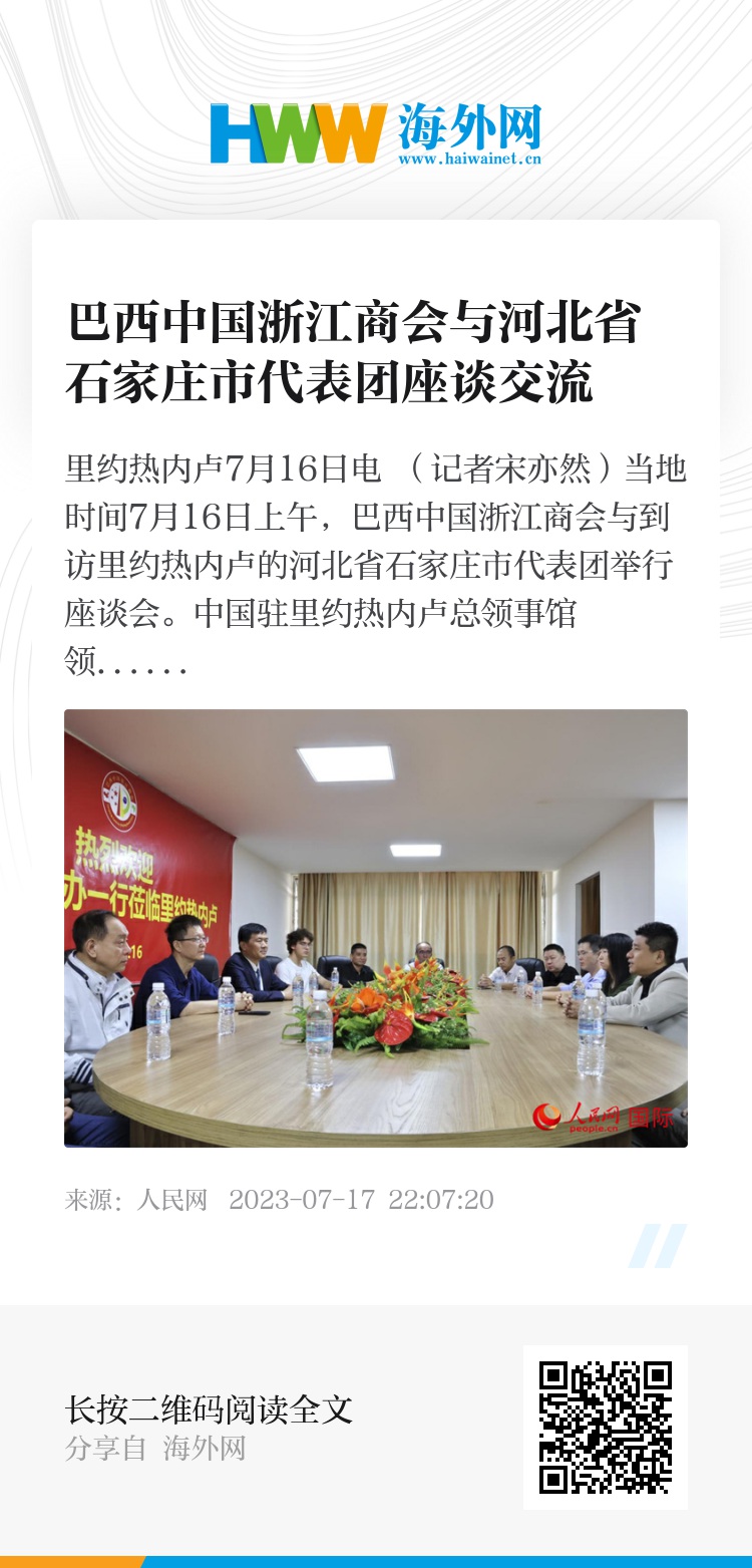 人民网里约热内卢7月16日电 (记者宋亦然)当地时间7月16日上午,巴西中国浙江商会与到访里约热内卢的河北省石家庄市代表团举行座谈会。中国驻里约热内卢总领事馆领侨处处长郭填甜、巴西中国浙江商会会长郑侠茂等出席并开展座谈交流。