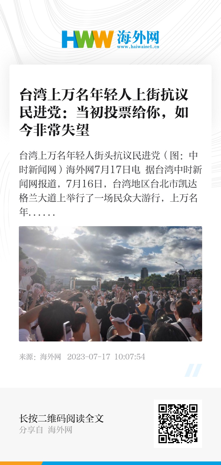 海外网7月17日电 据台湾中时新闻网报道,7月16日,台湾地区台北市凯达格兰大道上举行了一场民众大游行,上万名年轻人走上街头抗议民进党当局。有年轻妈妈表示,当初投票给民进党,但如今非常失望。