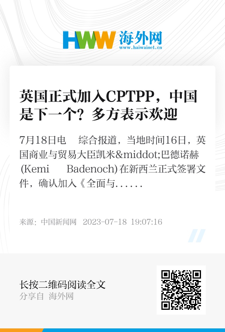 中新网7月18日电 综合报道,当地时间16日,英国商业与贸易大臣凯米·巴德诺赫(Kemi Badenoch)在新西兰正式签署文件,确认加入《全面与进步跨太平洋伙伴关系协定》(CPTPP)。随着英国完成主要程序,包括中国在内的其他国家和地区何时能加入,成为接下来外界关注的重点。