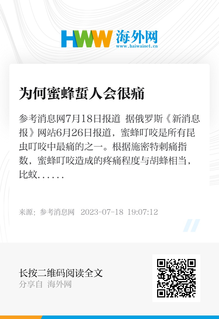 参考消息网7月18日报道 据俄罗斯《新消息报》网站6月26日报道,蜜蜂叮咬是所有昆虫叮咬中最痛的之一。根据施密特刺痛指数,蜜蜂叮咬造成的疼痛程度与胡蜂相当,比蚊子严重。