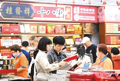 作为“津门十景”之一的天津古文化街近日开展特色文化活动,包括民间花会踩街、民间歌手驻唱、主街探店寻宝等,吸引游客探店“打卡”。图为游客在天津古文化街一家地方特色商品店选购。新华社记者 孙凡越摄
