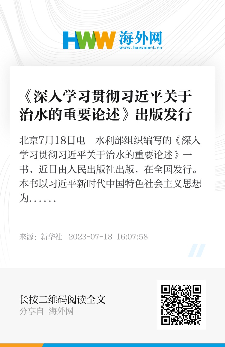 新华社北京7月18日电 水利部组织编写的《深入学习贯彻习近平关于治水的重要论述》一书,近日由人民出版社出版,在全国发行。