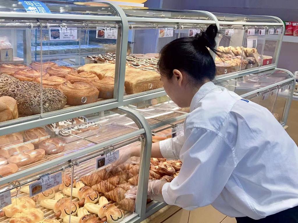 山西太原一家面包门店的员工正在整理烘焙鲜食。(受访单位供图)