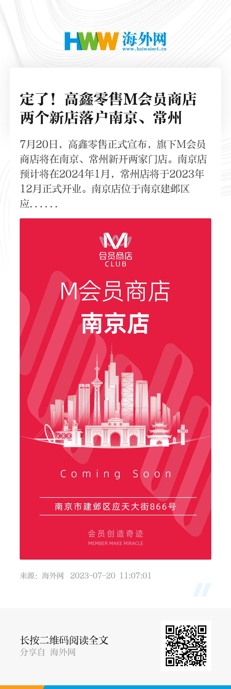 7月20日,高鑫零售正式宣布,旗下M会员商店将在南京、常州新开两家门店。南京店预计将在2024年1月,常州店将于2023年12月正式开业。