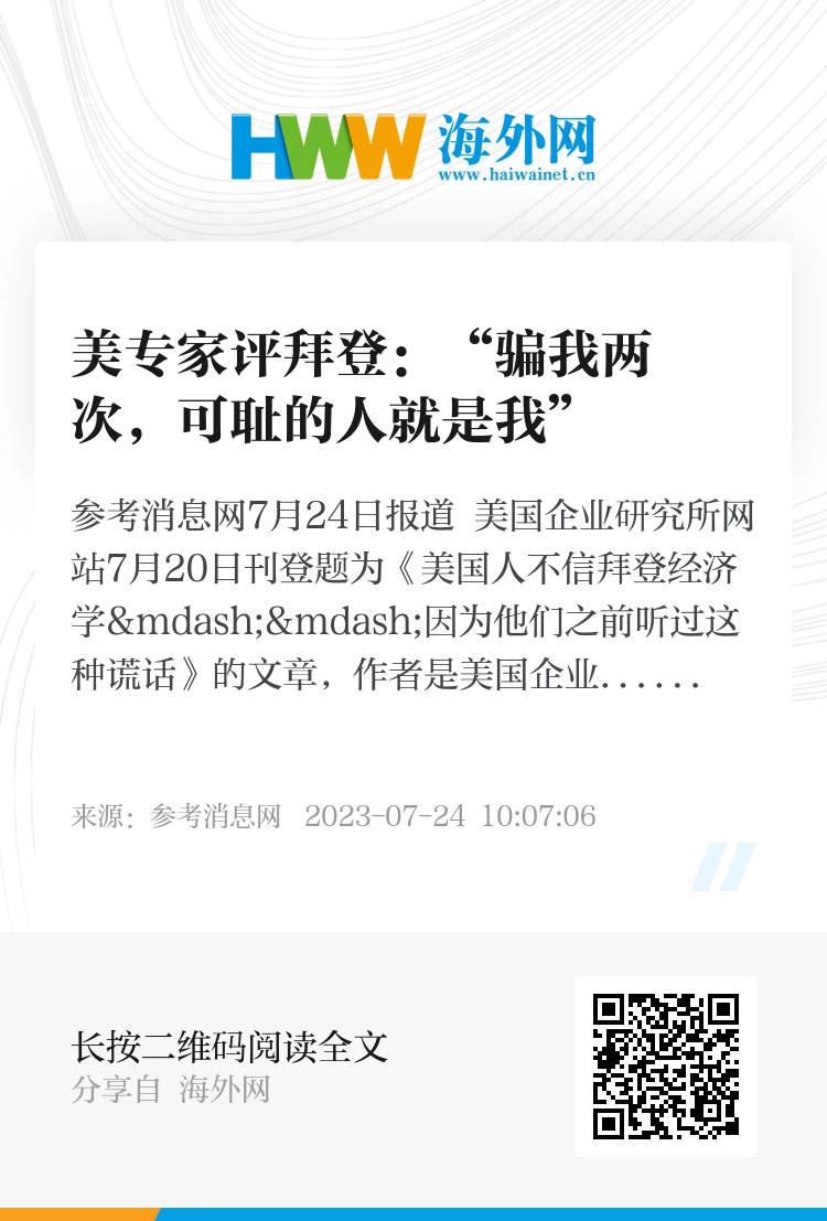 参考消息网7月24日报道 美国企业研究所网站7月20日刊登题为《美国人不信拜登经济学——因为他们之前听过这种谎话》的文章,作者是美国企业研究所高级研究员马特·魏丁格尔。文章摘编如下:
