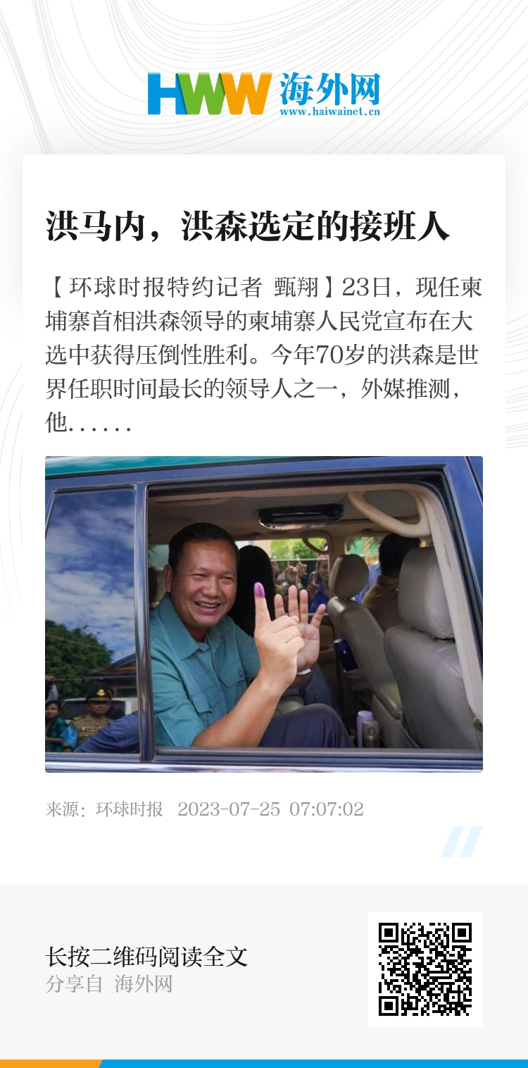 【环球时报特约记者 甄翔】23日,现任柬埔寨首相洪森领导的柬埔寨人民党宣布在大选中获得压倒性胜利。今年70岁的洪森是世界任职时间最长的领导人之一,外媒推测,他正苦心经营为儿子洪马内铺路,大选后将启动让儿子接班的进程。洪马内三个月前获晋升为四星上将,洪森亦为他排除所有竞争对手。洪森日前接受媒体采访,称儿子“可能最快三四个星期内便会成为首相”。