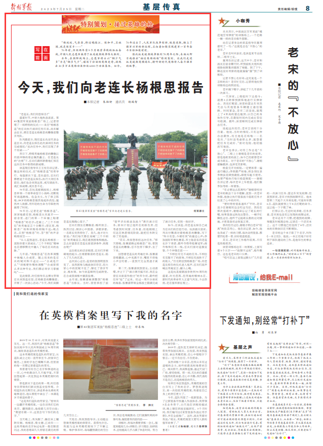 如今,在该连,向老连长报告已成为官兵们的自觉行动。抗洪救灾前夜,列兵付魏涛对着杨根思的雕像,写下“昨日有您,今朝有我”的豪迈心声;参加国际军事比赛前,军士陆亚东向老连长许下承诺,最终夺得单炮赛冠军;海外维和任务一线,官兵们面对连旗宣誓,个个冲锋在前……