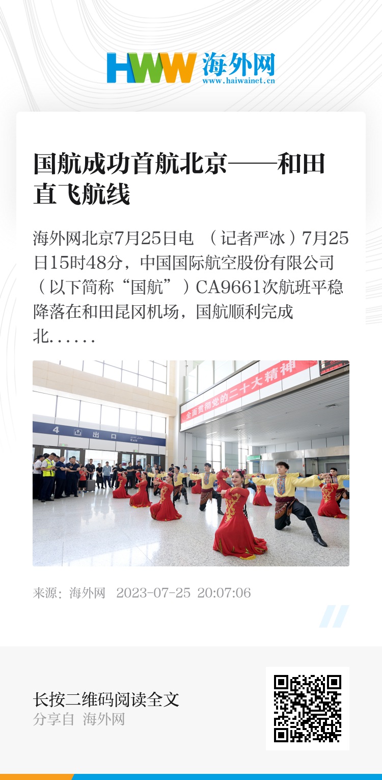 海外网北京7月25日电 (记者严冰)7月25日15时48分,中国国际航空股份有限公司(以下简称“国航”)CA9661次航班平稳降落在和田昆冈机场,国航顺利完成北京首都——和田直航航线首航,和田昆冈机场以民航界最高礼遇“过水门”仪式迎接首航航班抵达。