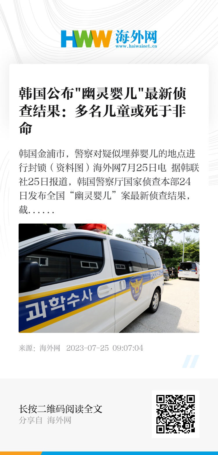 海外网7月25日电 据韩联社25日报道,韩国警察厅国家侦查本部24日发布全国“幽灵婴儿”案最新侦查结果,截至21日,发现255名未办理出生登记的孩子生死不明。