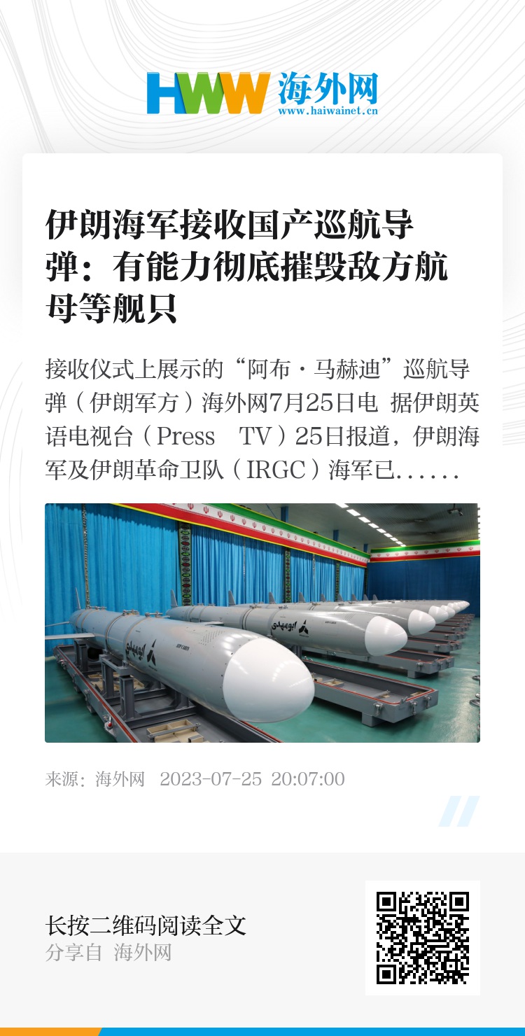 海外网7月25日电 据伊朗英语电视台(Press TV)25日报道,伊朗海军及伊朗革命卫队(IRGC)海军已接收该国自行设计和制造的“阿布·马赫迪”巡航导弹,该导弹具有适合电子战的最先进技术。伊朗军方警告,该导弹将有能力彻底摧毁敌方航母等所有靠近的舰只,迫使敌人远离伊朗海岸。