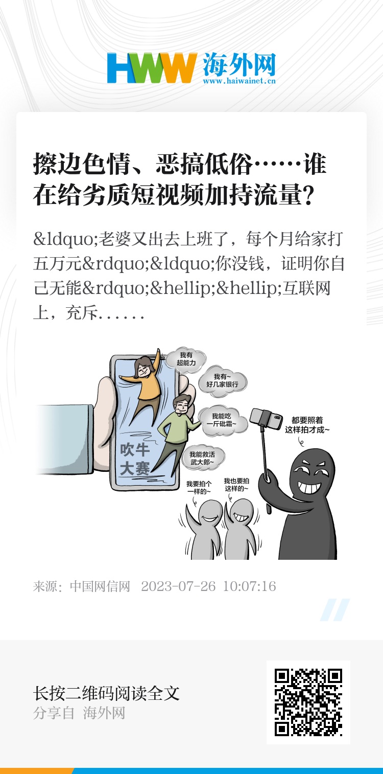 “老婆又出去上班了,每个月给家打五万元”“你没钱,证明你自己无能”……互联网上,充斥着一些劣质短视频,点赞评论量却不少。记者调查发现,这类或夸张恶搞,或打擦边球的短视频,从找素材到拍摄再到流量推广都有产业链。专家认为,劣质短视频流行不仅带来“信息茧房”,更会带人们进入质量更差且有害的“感官茧房”“情绪茧房”。
