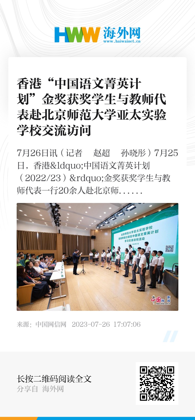 中国网7月26日讯(记者 赵超 孙晓彤)7月25日,香港“中国语文菁英计划(2022/23)”金奖获奖学生与教师代表一行20余人赴北京师范大学亚太实验学校交流访问。