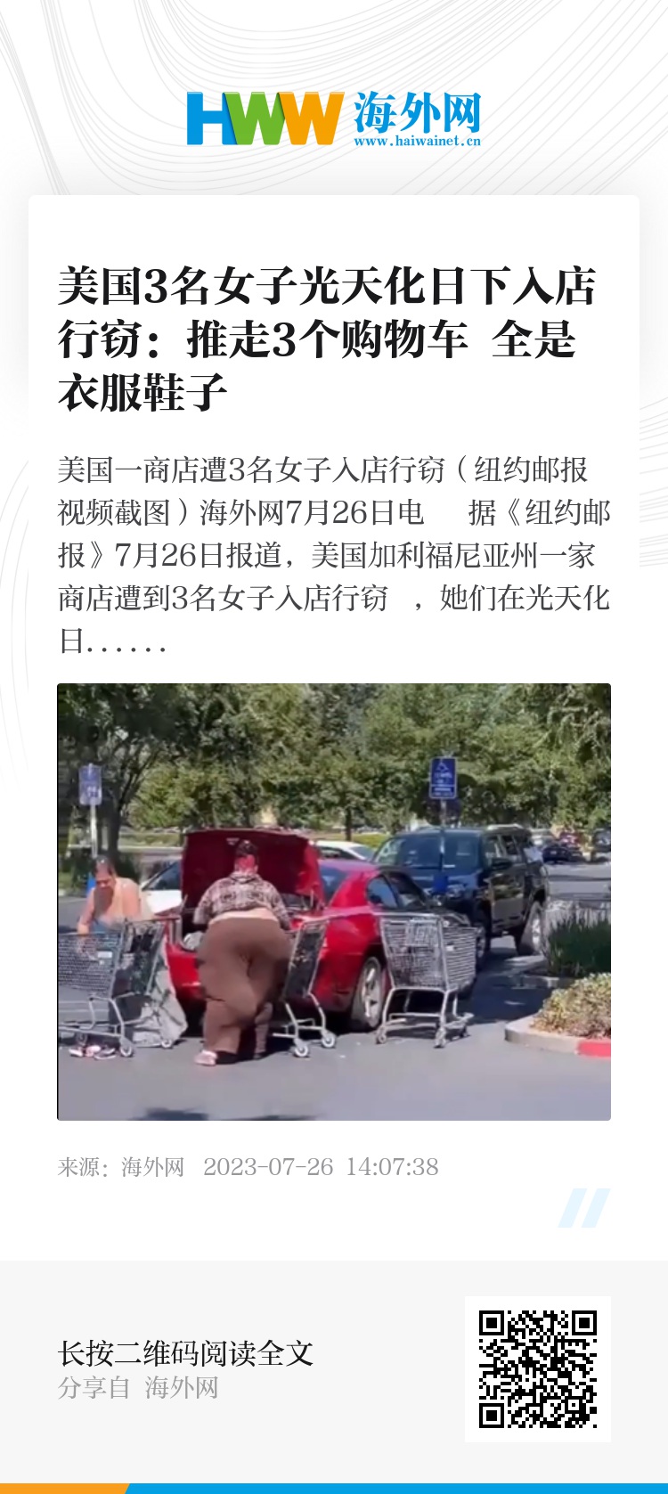 海外网7月26日电 据《纽约邮报》7月26日报道,美国加利福尼亚州一家商店遭到3名女子入店行窃 ,她们在光天化日之下,缓慢推走3个装满商品的购物车,现场被路人拍下。