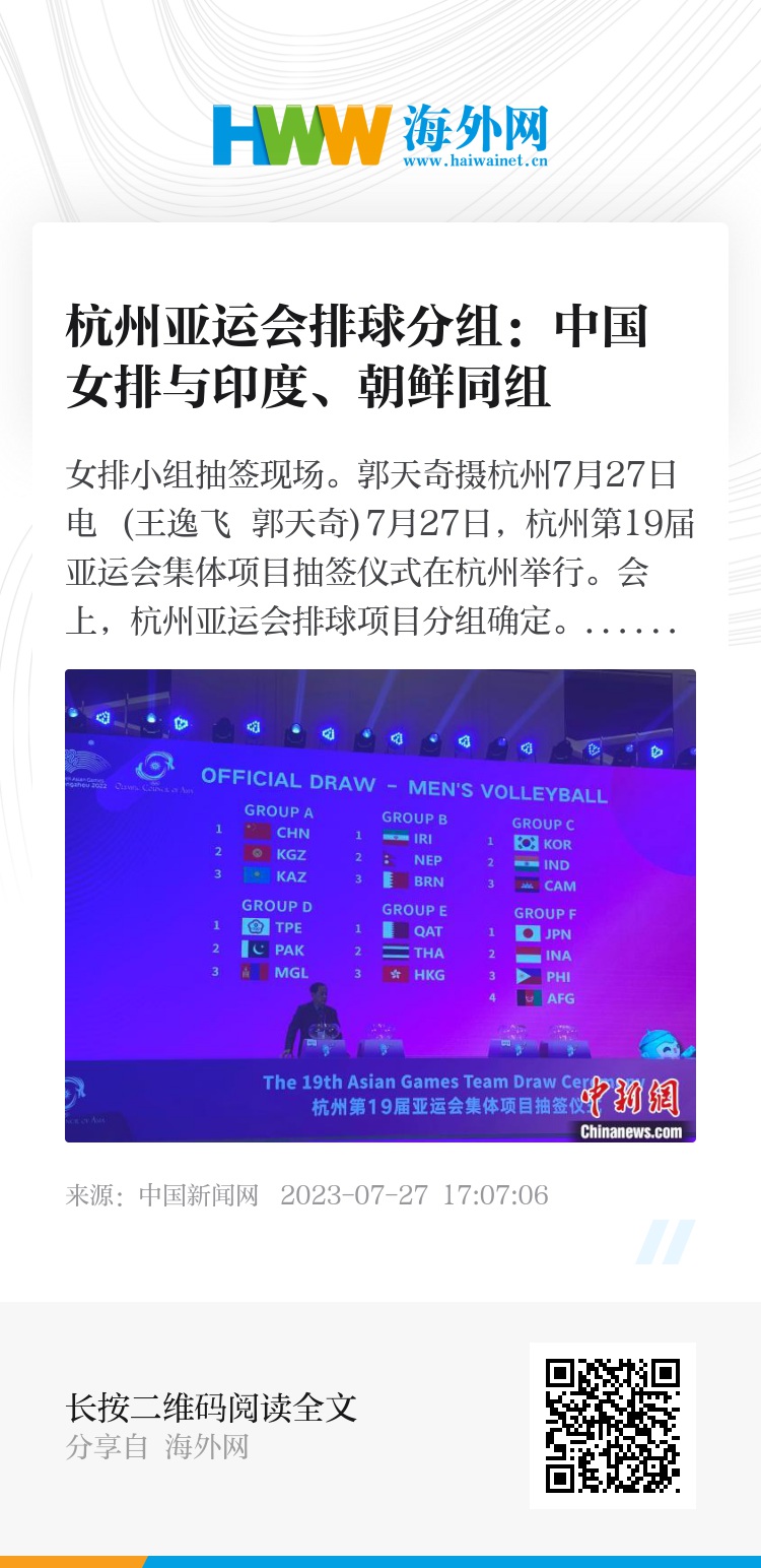 中新网杭州7月27日电 (王逸飞 郭天奇)7月27日,杭州第19届亚运会集体项目抽签仪式在杭州举行。会上,杭州亚运会排球项目分组确定。
