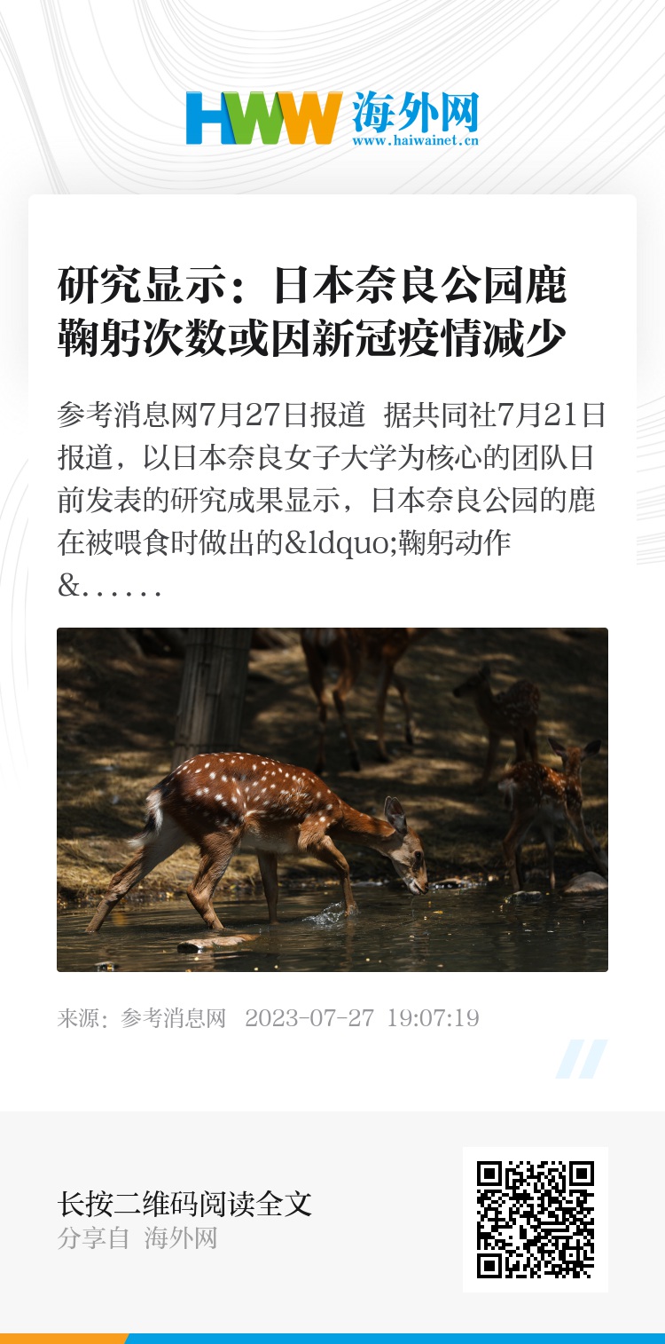 目前来自海外的游客数也呈复苏趋势,据悉鹿的鞠躬次数正逐步恢复至疫情前的水平。参与研究的奈良女子大学研究生院博士生上原春香表示:“今后还将调查野生动物如何受到人类影响,进一步研究人类应怎样与动物相处。”