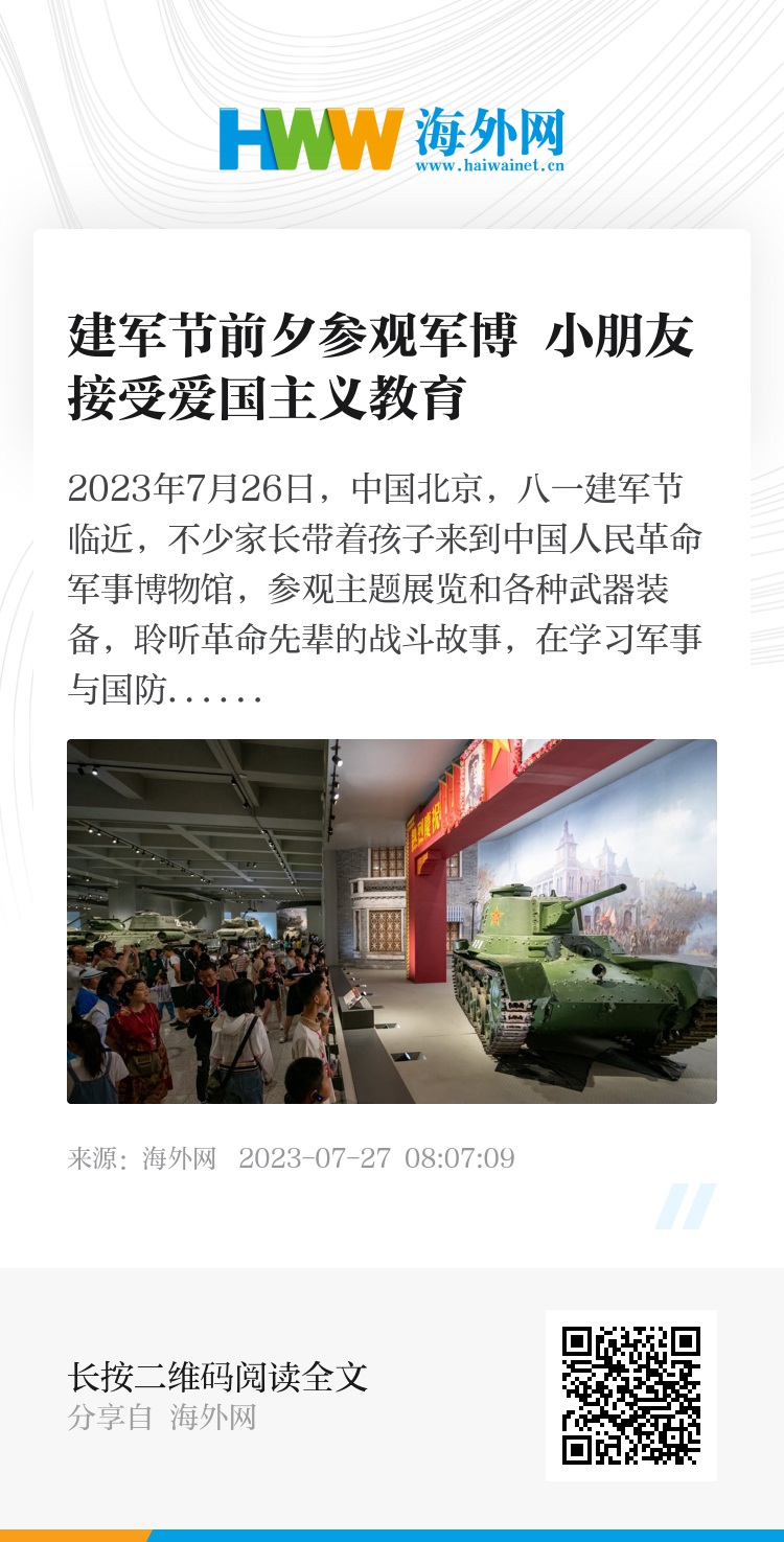 2023年7月26日,中国北京,八一建军节临近,不少家长带着孩子来到中国人民革命军事博物馆,参观主题展览和各种武器装备,聆听革命先辈的战斗故事,在学习军事与国防知识的同时,接受爱国主义教育。图源:IC photo