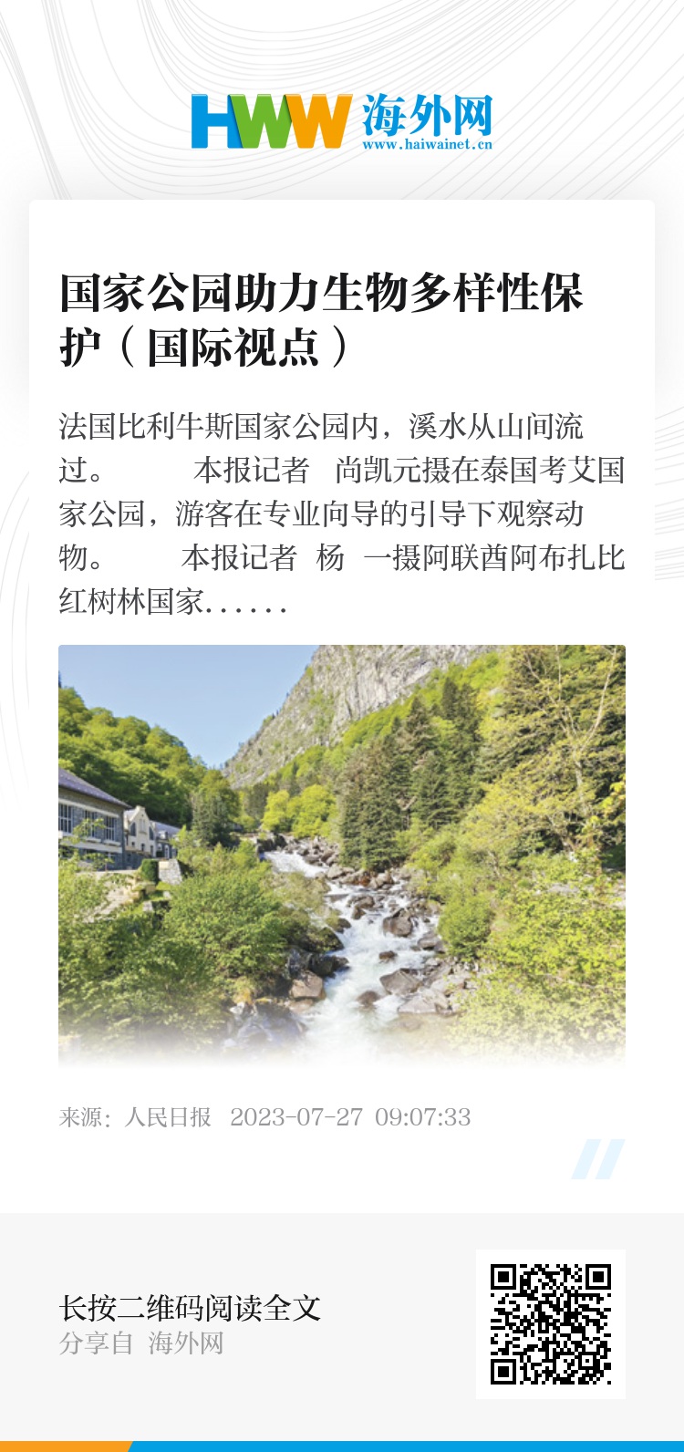 “核心区”“共建区”并非完全割裂,而是相互促进。以比利牛斯国家公园为例,其“核心区”面积约4.6万公顷,仅保留牧业和林业等传统活动。“共建区”面积约24.5万公顷,分布着60多个市镇,居住着约4万人口。这些“共建区”市镇与各方共同制定并遵守国家公园保护开发的章程,以实现保护自然和文化遗产、促进当地经济发展、提高公众环保意识等目标。“人类活动与自然之间的联系是保护生物多样性问题的核心。”比利牛斯国家公园园长梅利娜·罗斯表示。(本报记者 章念生 杨 一 张志文 尚凯元)