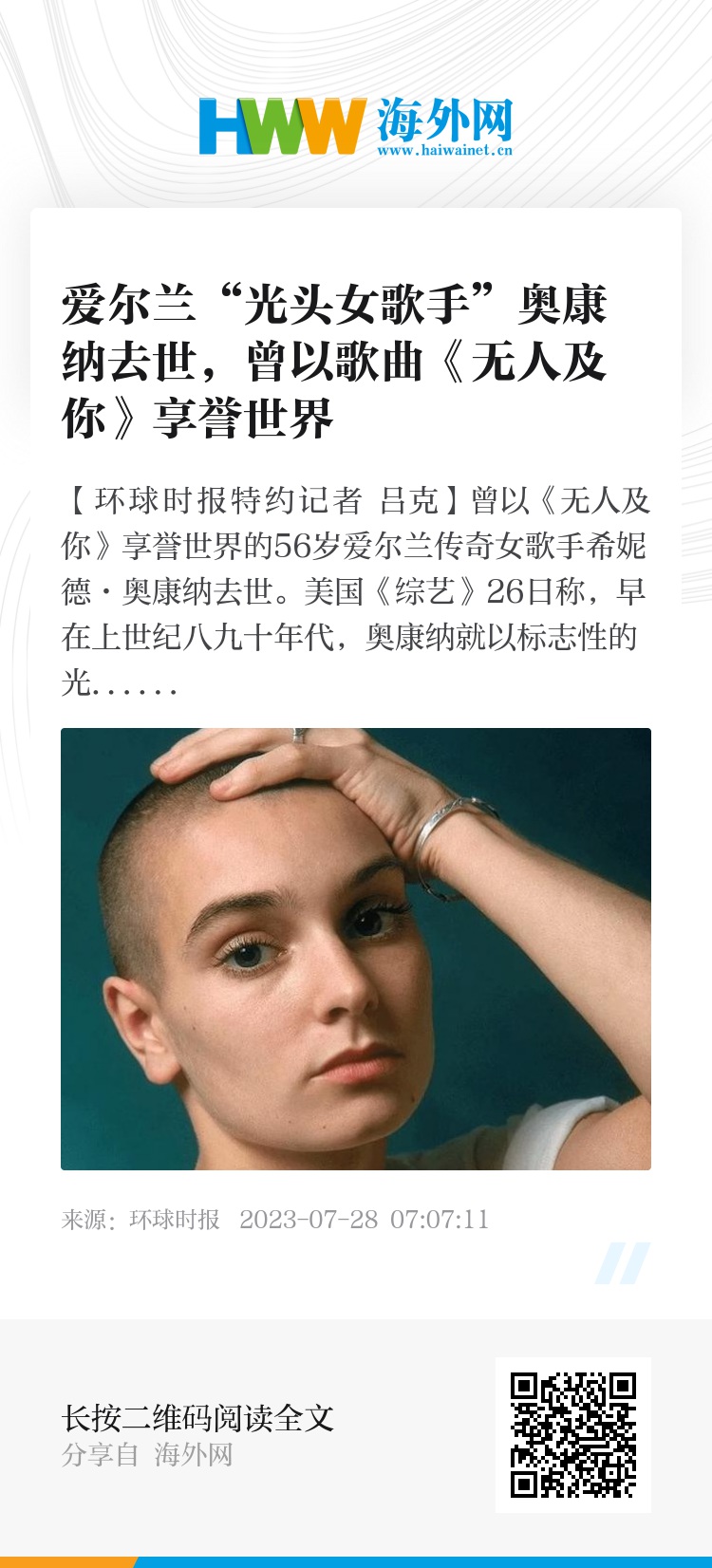 【环球时报特约记者 吕克】曾以《无人及你》享誉世界的56岁爱尔兰传奇女歌手希妮德·奥康纳去世。美国《综艺》26日称,早在上世纪八九十年代,奥康纳就以标志性的光头形象和叛逆作风,在世界歌坛独树一帜,同时也因为各种争议影响艺术生涯,近年长期同精神疾病做斗争。奥康纳原计划2024年重启世界巡演,如今突然传来离世的消息,令众多乐迷惋惜不已。