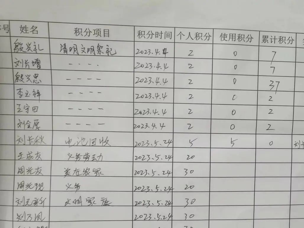 作为见证者和记录者,刘德凤用黑色签字笔仔细记下从“两山”超市进出的开支。翻开刘德凤的记账簿,“积分项目”“积分时间”“个人积分”“使用积分”等条目清晰地记录下村民的积分和兑换明细。其中,“电池回收”“清明文明祭扫”“义务劳动”“门前种植绿化花木”等项目是日常行为积分,“美在农家”“文明家庭”“好媳妇”“好婆婆”等项目则是由村两委定期开会评选的荣誉奖励。