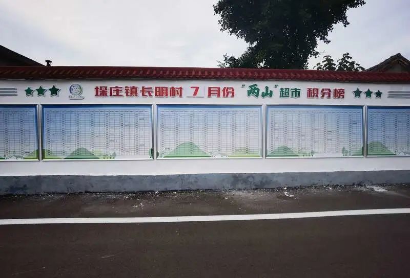 “两山”超市积分榜被打印放大后张贴在村口小广场边,690户村民的积分一目了然。“通过积分评比,增强村民的荣誉感,让大家能自觉维护村容村貌,积极参与环境治理。”长明村支书刘乃江说。