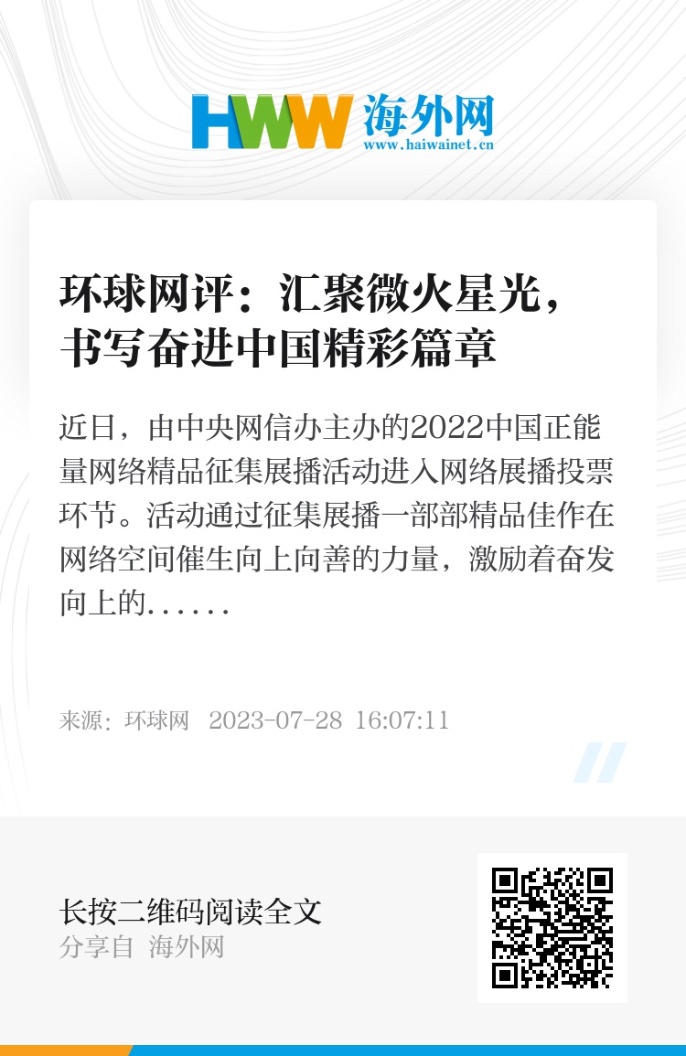 总有一组图文振人心扉,总有一个故事催人奋进。2022中国正能量网络精品征集展播活动以精品力作为载体,以时代榜样为蓝本,在最美记录里积攒奋斗能量,更好激励拼搏者、引领后来人,续写精彩中国的崭新篇章。(戴治国)