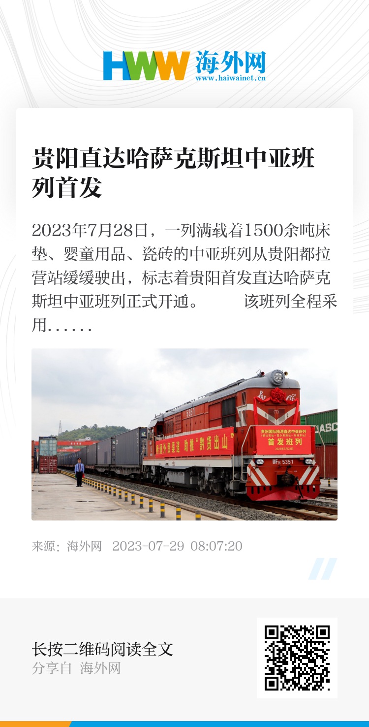 2023年7月28日,一列满载着1500余吨床垫、婴童用品、瓷砖的中亚班列从贵阳都拉营站缓缓驶出,标志着贵阳首发直达哈萨克斯坦中亚班列正式开通。 该班列全程采用集装箱“公路—铁路—公路”的国际多式联运方式,经贵阳综合保税区报关,从贵阳国际陆港装车出发,经新疆霍尔果斯口岸出境至哈萨克斯坦(阿拉木图)热特苏站,单程在途时间约11天。图源:IC photo