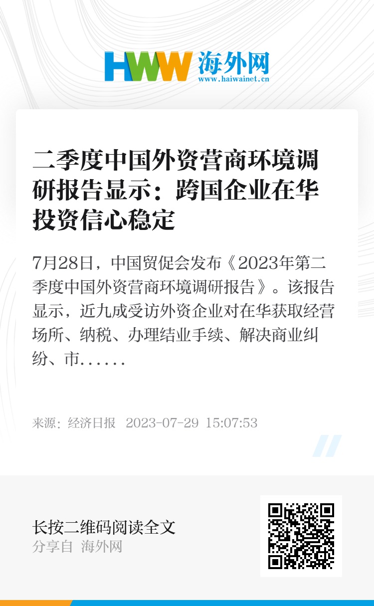 7月28日,中国贸促会发布《2023年第二季度中国外资营商环境调研报告》。该报告显示,近九成受访外资企业对在华获取经营场所、纳税、办理结业手续、解决商业纠纷、市政公用基础设施报装、市场准入、跨境贸易、促进市场竞争指标评价“满意”以上。超九成受访外资企业对2022年四季度以来中央出台的外资政策评价“满意”以上,近九成受访外资企业对地方政府出台的外资举措评价“满意”以上。