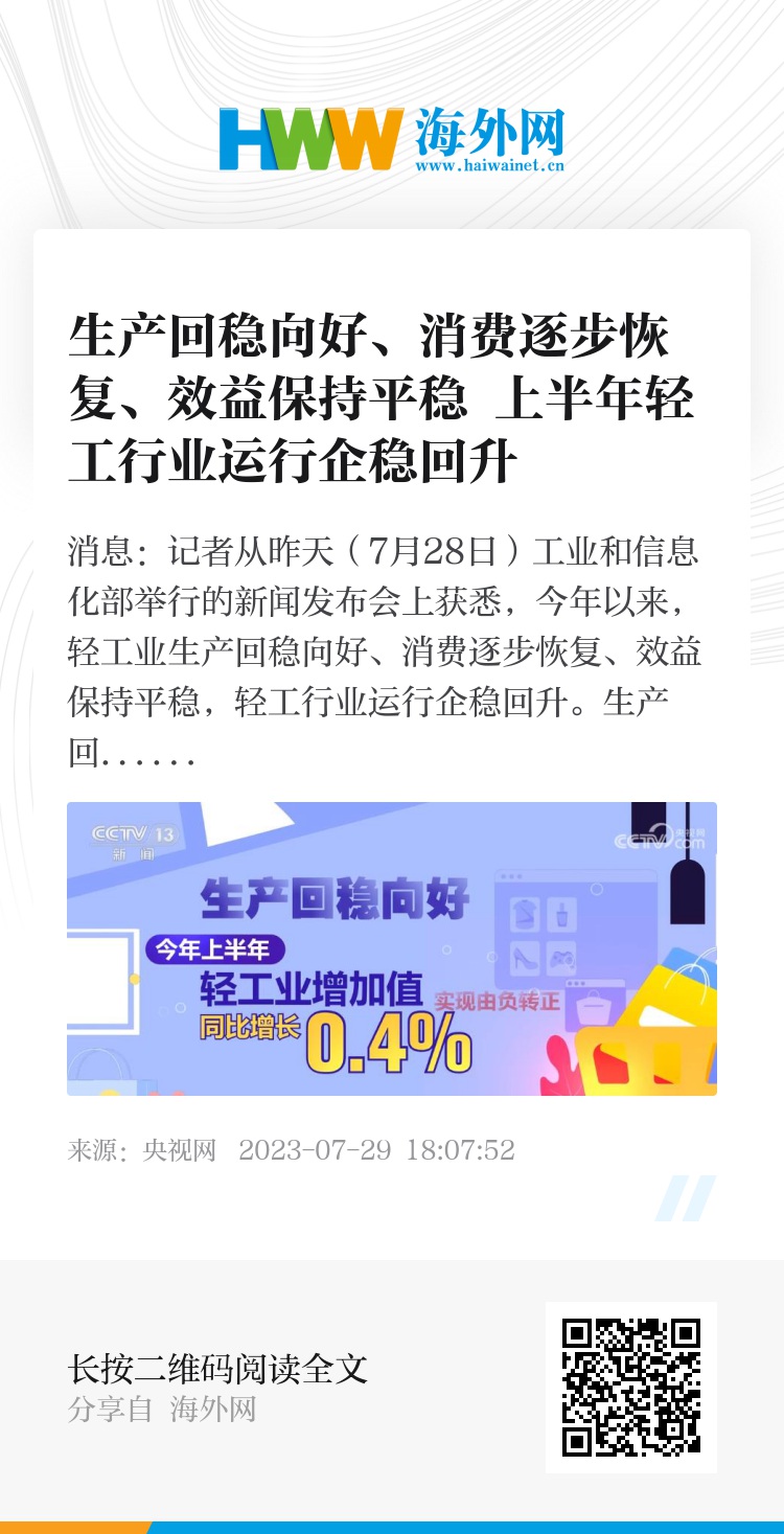央视网消息:记者从昨天(7月28日)工业和信息化部举行的新闻发布会上获悉,今年以来,轻工业生产回稳向好、消费逐步恢复、效益保持平稳,轻工行业运行企稳回升。