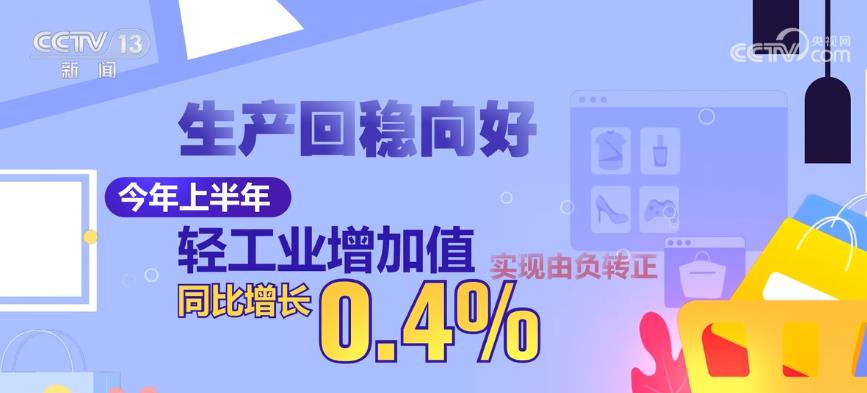 生产回稳向好。今年上半年,轻工业增加值同比增长0.4%,实现由负转正。其中,6月当月,轻工业增加值同比增长2.3%,较5月回升1.7个百分点。