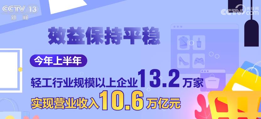 效益保持平稳。今年上半年,轻工行业规模以上企业13.2万家,实现营业收入10.6万亿元,同比增长2.1%,高于全国工业2.5个百分点,实现利润5682亿元。