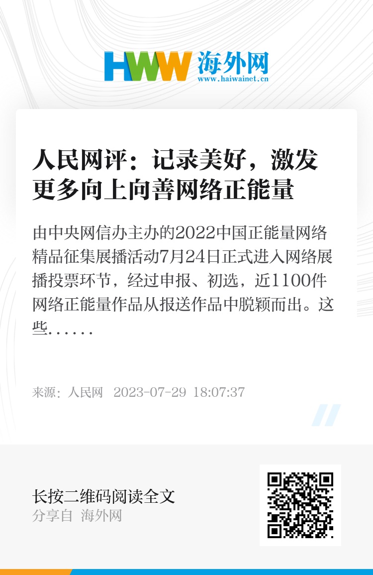 由中央网信办主办的2022中国正能量网络精品征集展播活动7月24日正式进入网络展播投票环节,经过申报、初选,近1100件网络正能量作品从报送作品中脱颖而出。这些作品以文字、图片、音视频、专题栏目、主题活动等多种多样的形式生动展现中国正能量,讲述平凡又伟大的中国故事,为网络空间汇聚注入了强大正能量,让向上向善的正能量从网络传递到人心,也用主旋律奏响奋进乐章。