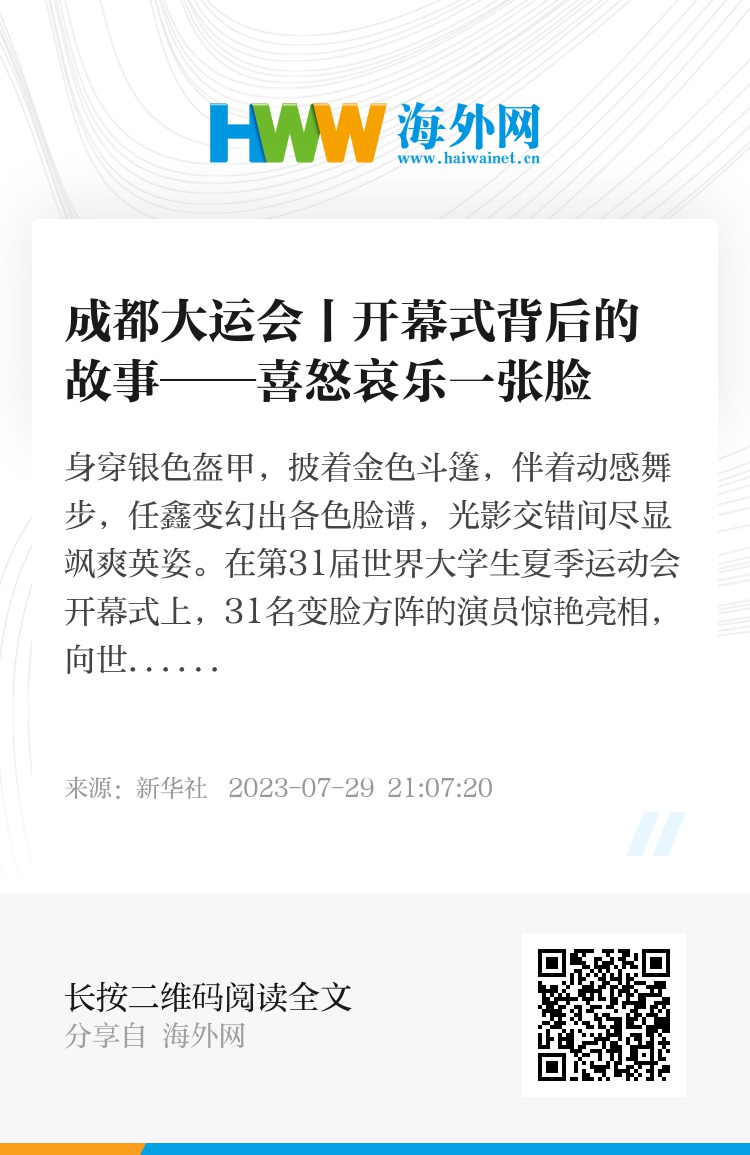 身穿银色盔甲,披着金色斗篷,伴着动感舞步,任鑫变幻出各色脸谱,光影交错间尽显飒爽英姿。在第31届世界大学生夏季运动会开幕式上,31名变脸方阵的演员惊艳亮相,向世界展示了成都古老的非遗文化——川剧变脸,将现场气氛推向高潮。