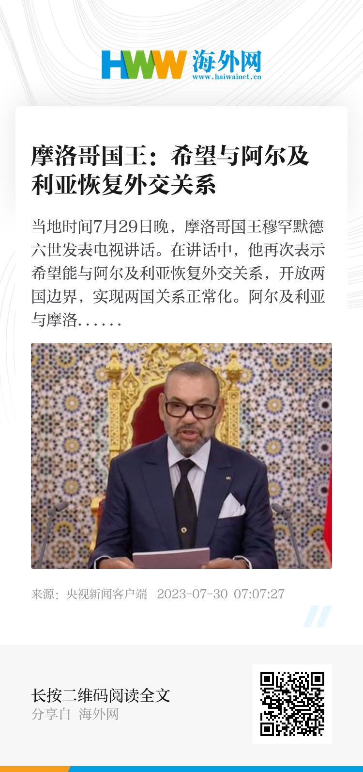当地时间7月29日晚,摩洛哥国王穆罕默德六世发表电视讲话。在讲话中,他再次表示希望能与阿尔及利亚恢复外交关系,开放两国边界,实现两国关系正常化。