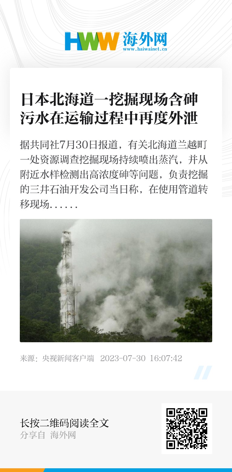 据共同社7月30日报道,有关北海道兰越町一处资源调查挖掘现场持续喷出蒸汽,并从附近水样检测出高浓度砷等问题,负责挖掘的三井石油开发公司当日称,在使用管道转移现场周边含砷的污水时,除此前(20日)有约2000升污水泄漏外,又有约10000升污水在运输过程中发生了外泄。