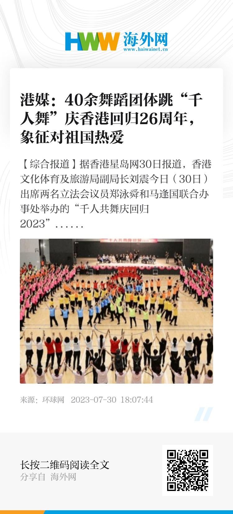 30日,40余舞蹈团体跳“千人舞”庆香港回归26周年 图自香港星岛网