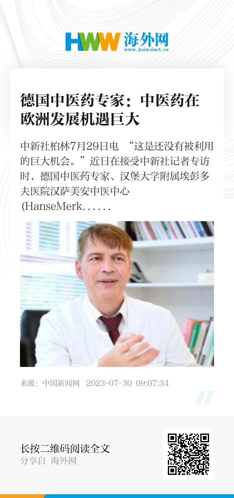 中新社柏林7月29日电 “这是还没有被利用的巨大机会。”近日在接受中新社记者专访时,德国中医药专家、汉堡大学附属埃彭多夫医院汉萨美安中医中心(HanseMerkur Center for TCM at the University Medical Center Hamburg-Eppendorf)主任斯文·施罗德教授表示,中医药在欧洲存在巨大发展机遇,他鼓励中国药业公司勇敢进入欧洲市场。