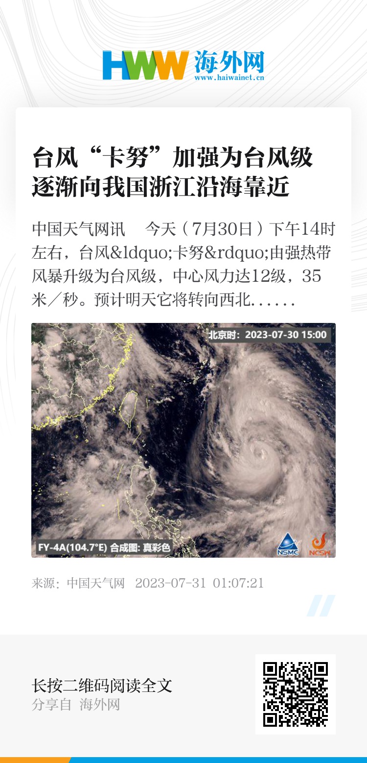 “卡努”最大可能在8月2日下午至夜间,登陆我国浙江沿海,登陆时强度较强,或以强台风或超强台风级别登陆。