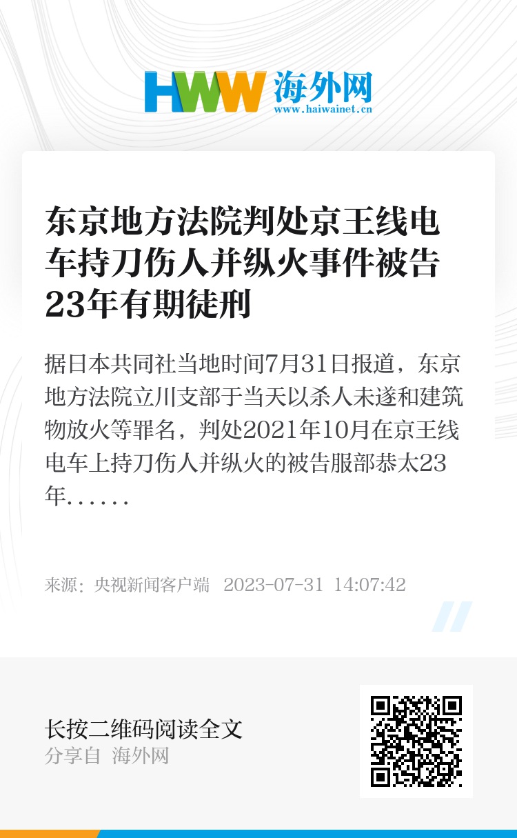 据日本共同社当地时间7月31日报道,东京地方法院立川支部于当天以杀人未遂和建筑物放火等罪名,判处2021年10月在京王线电车上持刀伤人并纵火的被告服部恭太23年有期徒刑。