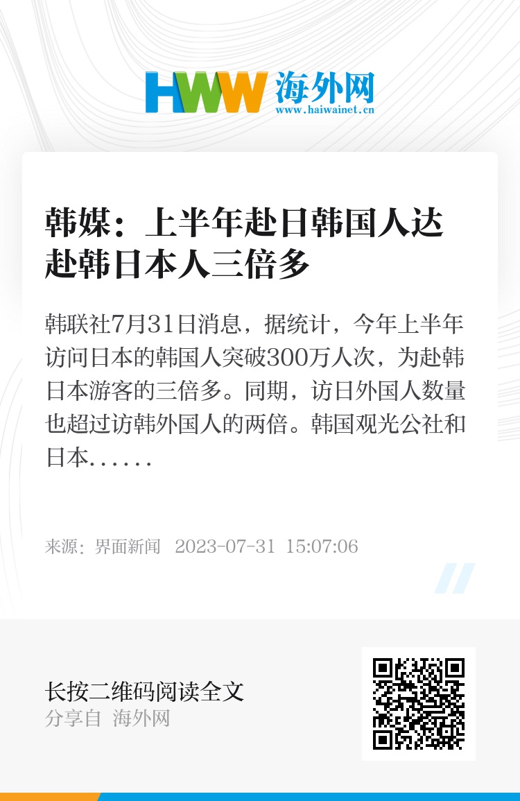 韩联社7月31日消息,据统计,今年上半年访问日本的韩国人突破300万人次,为赴韩日本游客的三倍多。同期,访日外国人数量也超过访韩外国人的两倍。