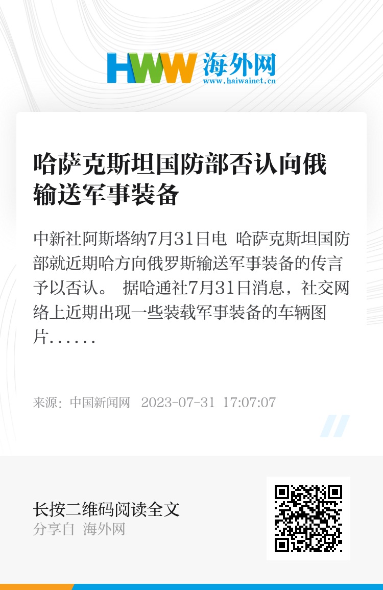 中新社阿斯塔纳7月31日电 哈萨克斯坦国防部就近期哈方向俄罗斯输送军事装备的传言予以否认。