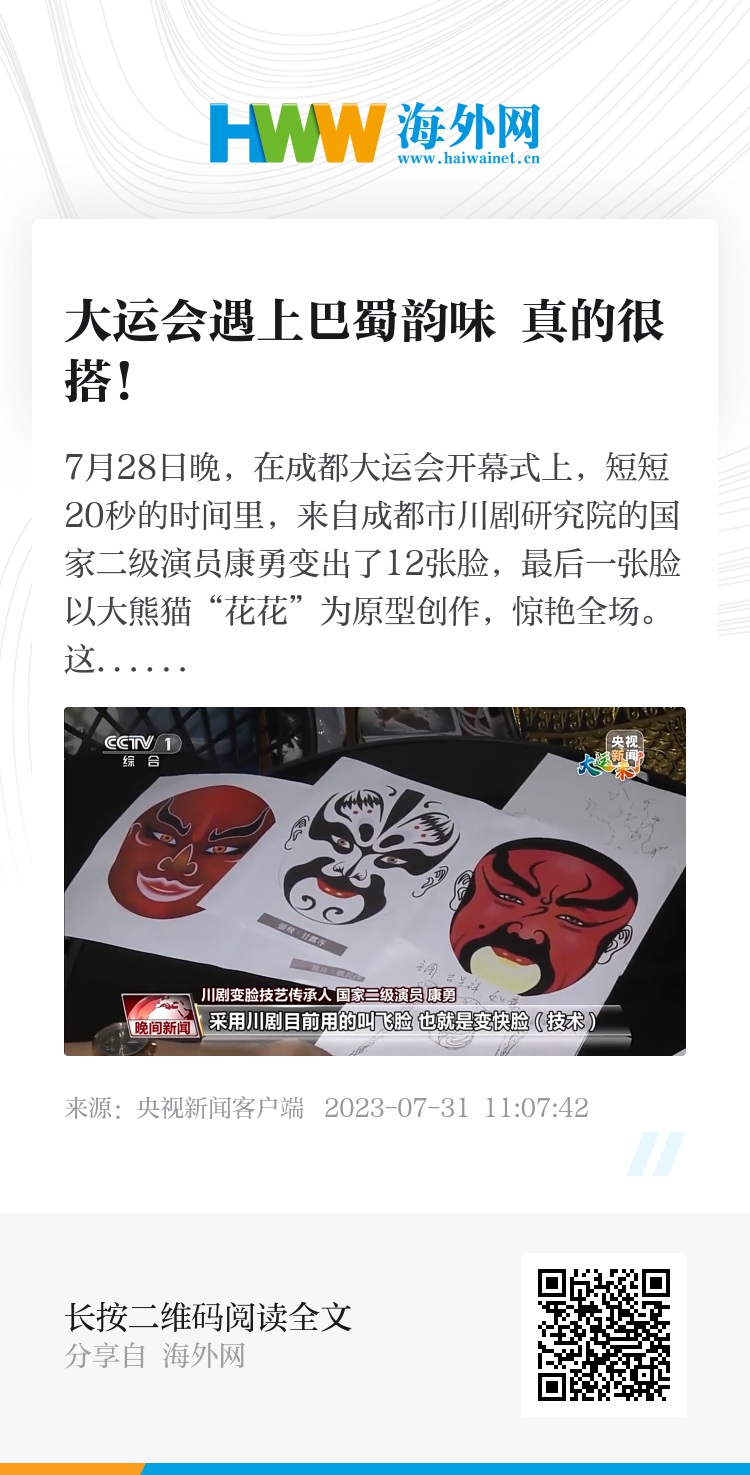 7月28日晚,在成都大运会开幕式上,短短20秒的时间里,来自成都市川剧研究院的国家二级演员康勇变出了12张脸,最后一张脸以大熊猫“花花”为原型创作,惊艳全场。这次的变脸有何特殊之处,一起来看看。