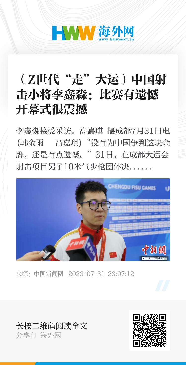 中新网成都7月31日电 (韩金雨 高嘉琪)“没有为中国争到这块金牌,还是有点遗憾。”31日,在成都大运会射击项目男子10米气步枪团体决赛后,来自复旦大学的21岁射击小将李鑫淼说道。