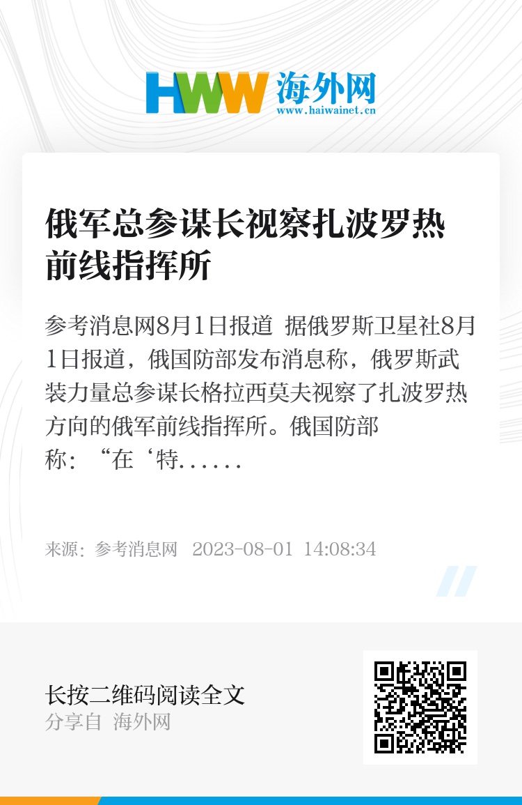 参考消息网8月1日报道 据俄罗斯卫星社8月1日报道,俄国防部发布消息称,俄罗斯武装力量总参谋长格拉西莫夫视察了扎波罗热方向的俄军前线指挥所。
